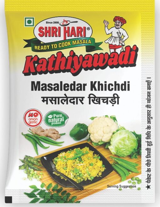 Recipe: Wash and keep dal and rice in the cooker with the required amount of water & cook it properly. Make a paste of green chilli and ginger. Cut all the vegetables properly. Heat peanut oil and add Ginger-Green Chilli paste, Curry leaves, add chopped vegetables and entire Shri Hari Kathiawadi Masaledar (Spicy) Khichdi masala from the packet and mix it well. Your spicy khichdi is ready. Garnish it with coriander and serve it.